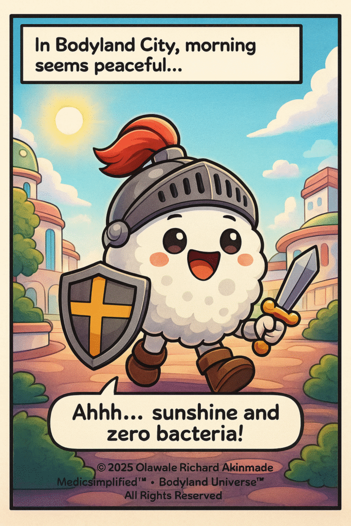 This is NeutroKnight™, a brave and energetic white blood cell who patrols the streets of Bodyland™ every morning. With his silver helmet and bright shield, he takes his job seriously — even when the day looks peaceful.